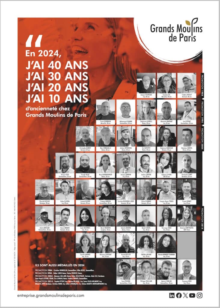 Félicitations aux 65 médaillés de 2024 pour leur engagement et leur contribution tout au long de ces années. Ce sont ces femmes et ces hommes qui font grandir Grands Moulins de Paris et qui emmènent notre belle entreprise vers son prochain centenaire !